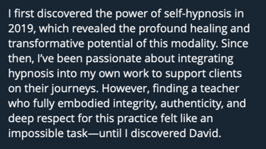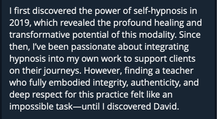 Hypnosis is, without a doubt, the most powerful change agent known to mankind. Once you understand its principles and practice efficiently, you will dissolve the limits of what you thought was possible for your clients... and yourself.